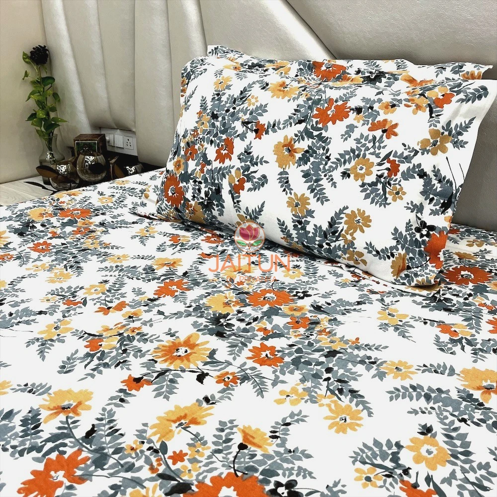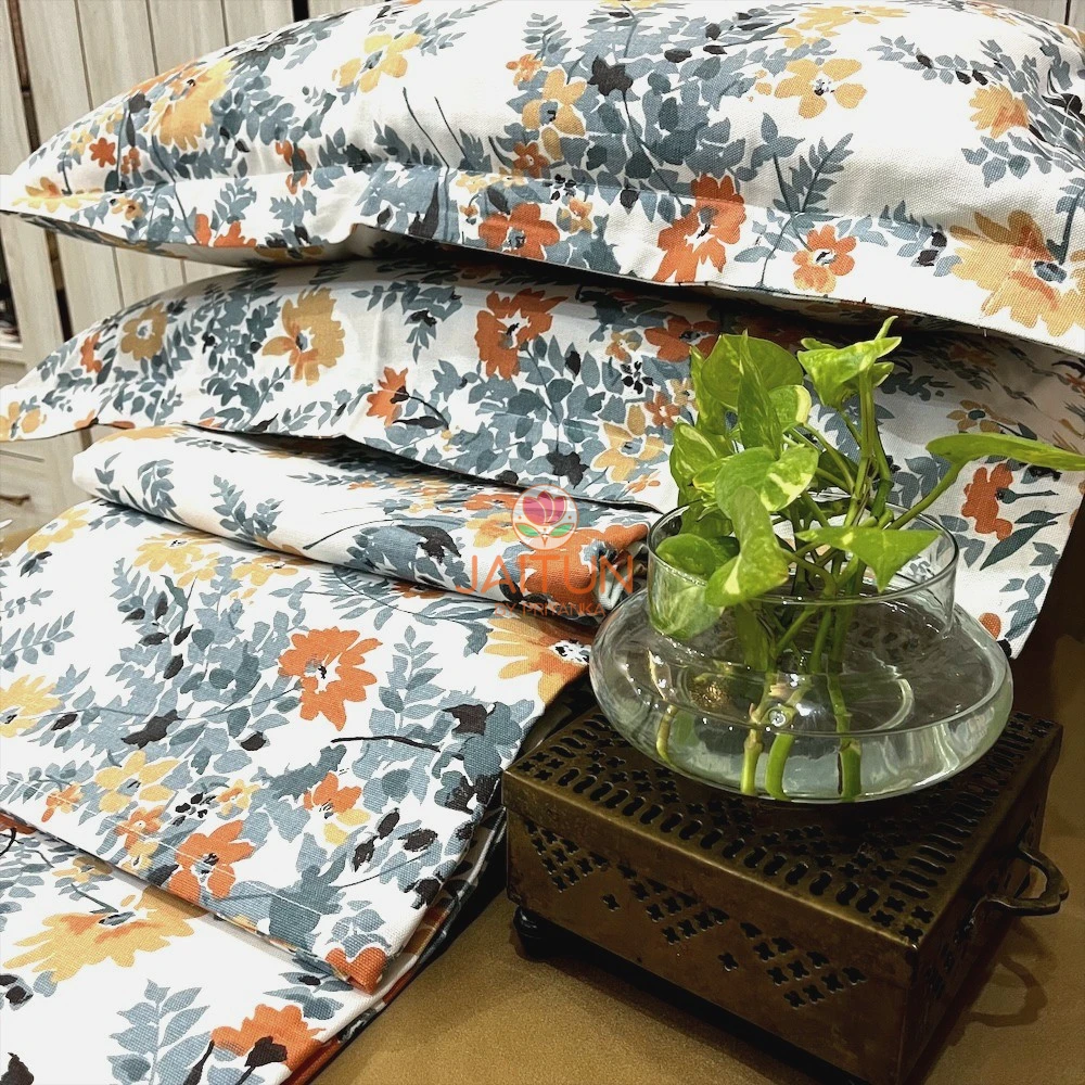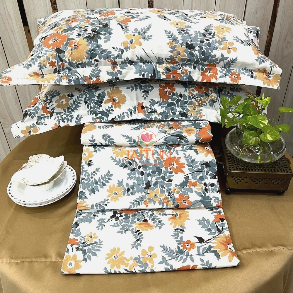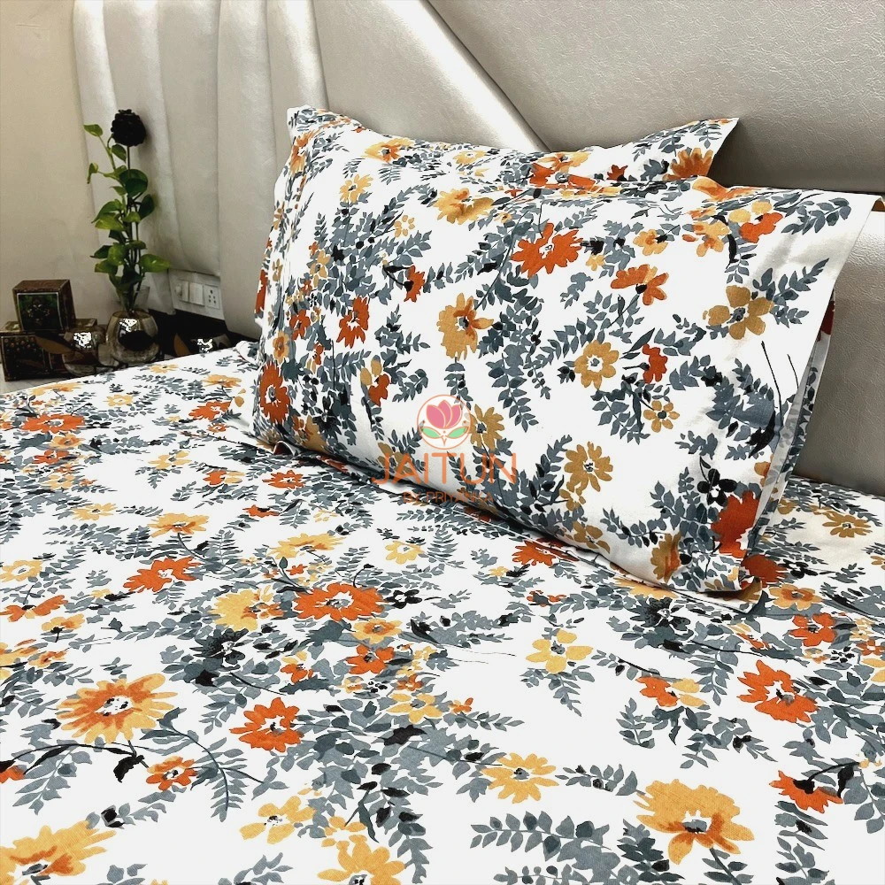 Welcome the charm of changing seasons into your bedroom with Autumn Garden Bloom Bed sheet Set. Inspired by the quiet beauty of fall, this exquisite bed sheet showcases a graceful floral print in hues of mustard yellow, rust orange, and soft grey, delicately scattered across a pristine white base.