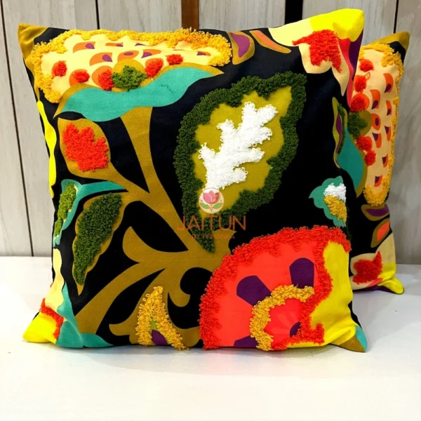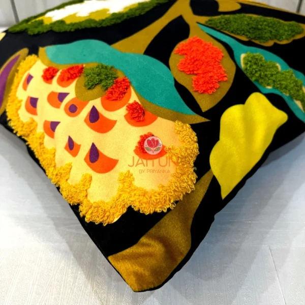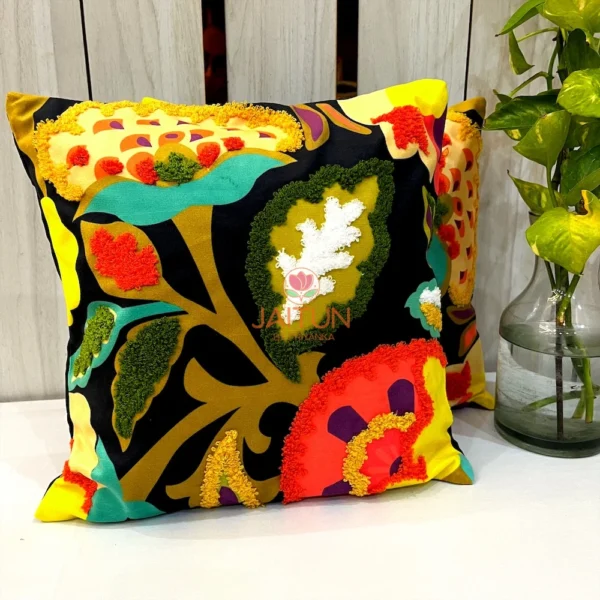 Bring home the joy of eclectic design with our Boho Garden Appliqué Cushion Cover. Featuring an enchanting mix of bold floral and foliage motifs, this cushion cover stands out with its multi colour palette of mustard yellow, coral red, lime green, teal, and black. The hand-appliquéd and tufted thread-work adds rich texture and a 3D tactile feel, making it a vibrant addition to any decor.