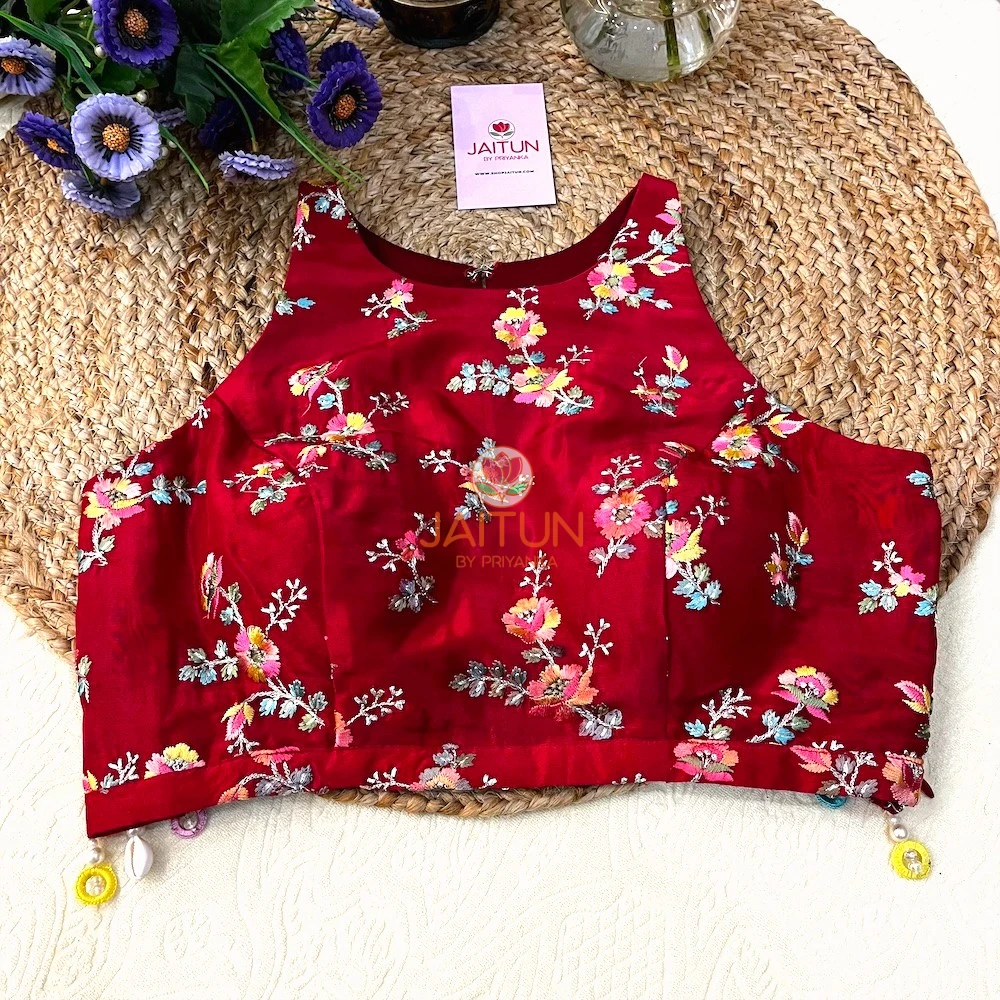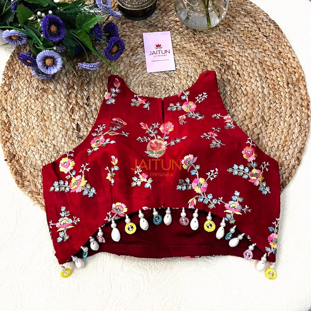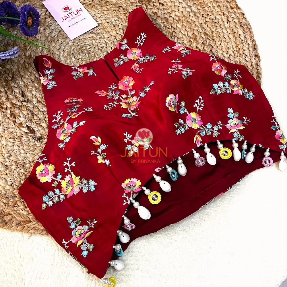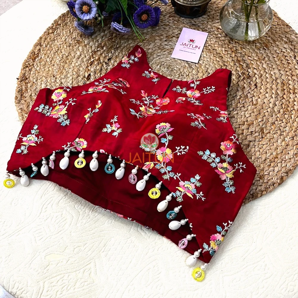 Step into the spotlight with the Crimson Bloom Hand-Embroidered Wedding Collection Blouse, a masterpiece designed for brides, bridesmaids, and wedding guests who love traditional artistry with a contemporary twist. Crafted from premium crimson silk, this blouse features exquisite multicolour floral embroidery inspired by Mughal garden motifs. The intricate needlework is paired with playful multicolour beads and pearl drop embellishments along the hemline, adding a touch of whimsy and festivity.