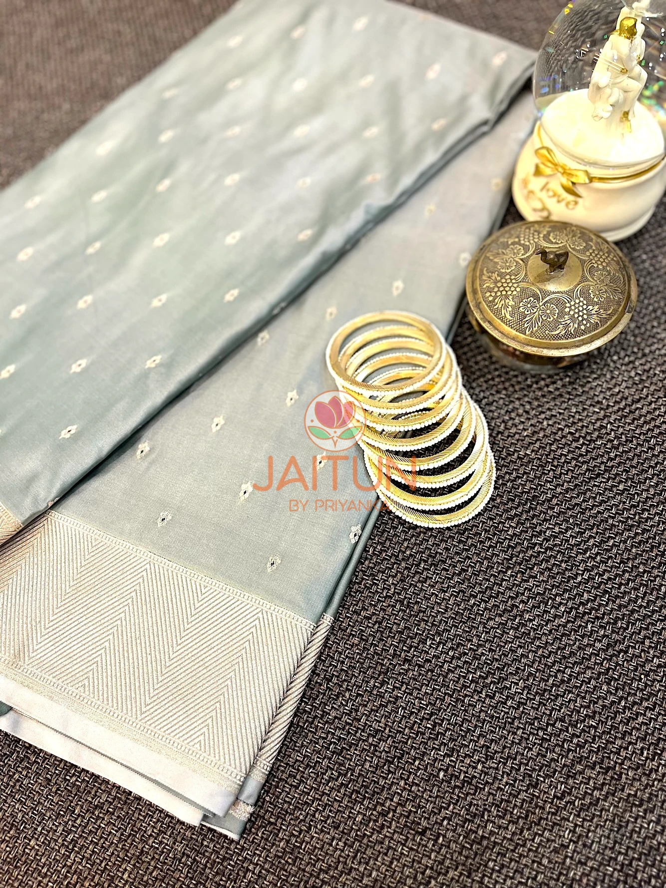 Step into understated luxury with this exquisite grey Banarasi silk saree, crafted to perfection for the modern woman who cherishes heritage weaves. Featuring fine ivory zari motifs scattered gracefully across the body, this saree is elevated by a beautifully woven chevron-design border and pallu in rich zari. The soft silk drapes effortlessly, making it ideal for festive occasions, weddings, and elegant evening events. Pair it with traditional jewellery to complete your regal look.