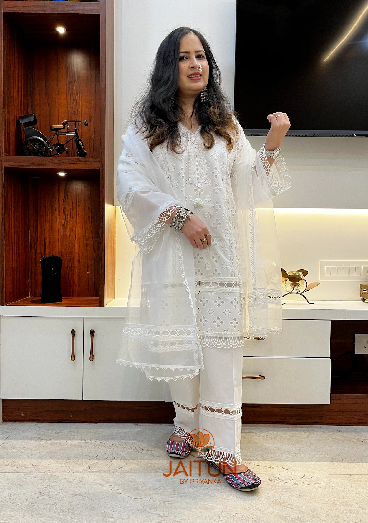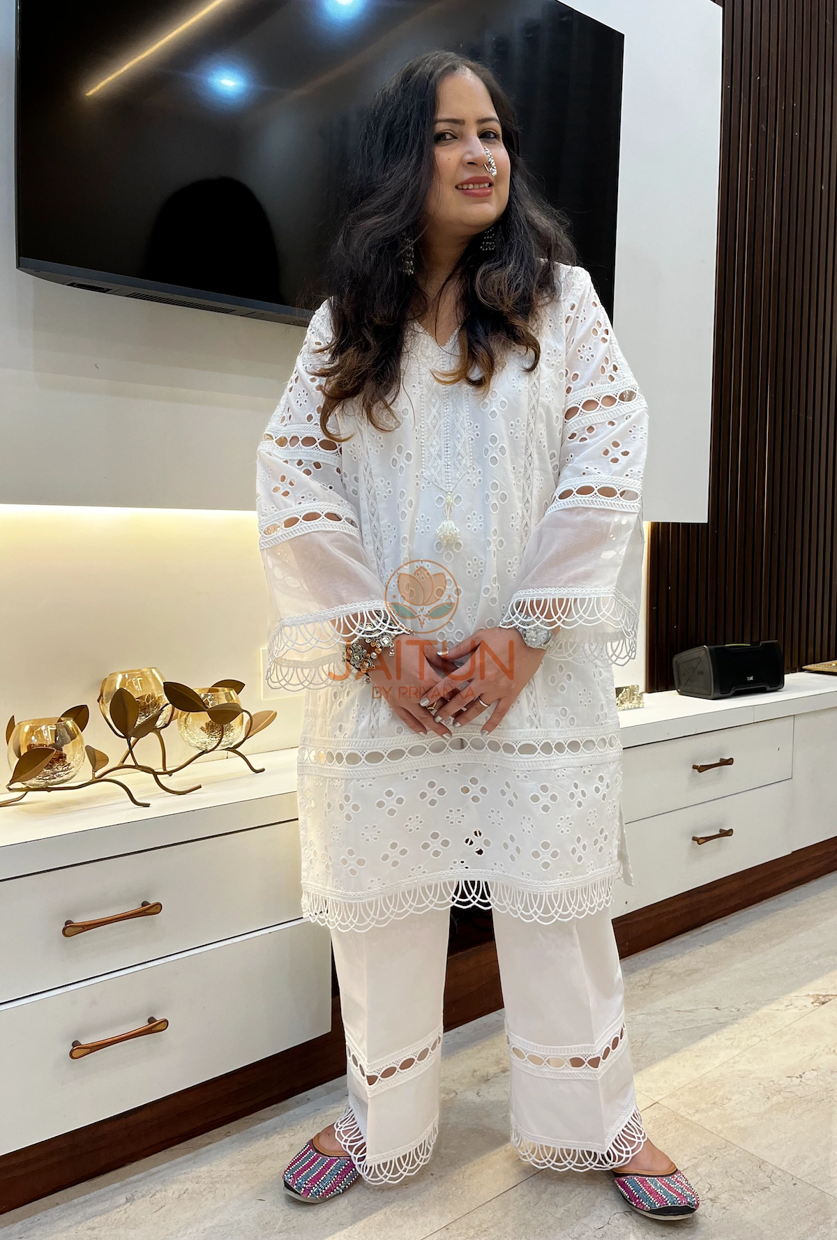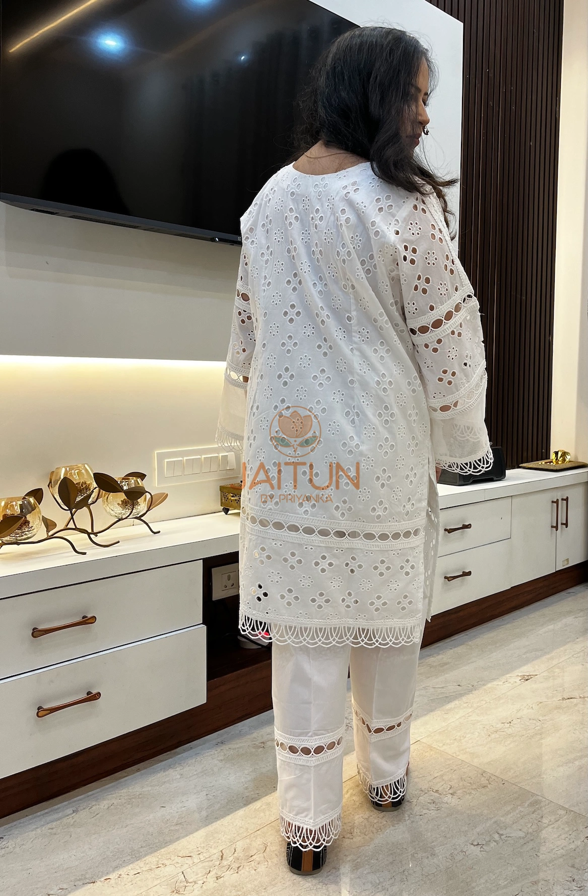 Embrace the essence of pure elegance with our White White Cotton Shifli Suit Set. This two-piece ensemble features a beautifully crafted tunic adorned with intricate lace patterns and cutwork that exude a timeless charm. The lightweight fabric ensures comfort without compromising on style, while the matching pants provide a seamless look. With its versatile design, this set can be dressed up for festive season or styled down for an elevated everyday outfit. Whether you’re attending a garden party or enjoying an evening out, this set will keep you looking effortlessly chic.