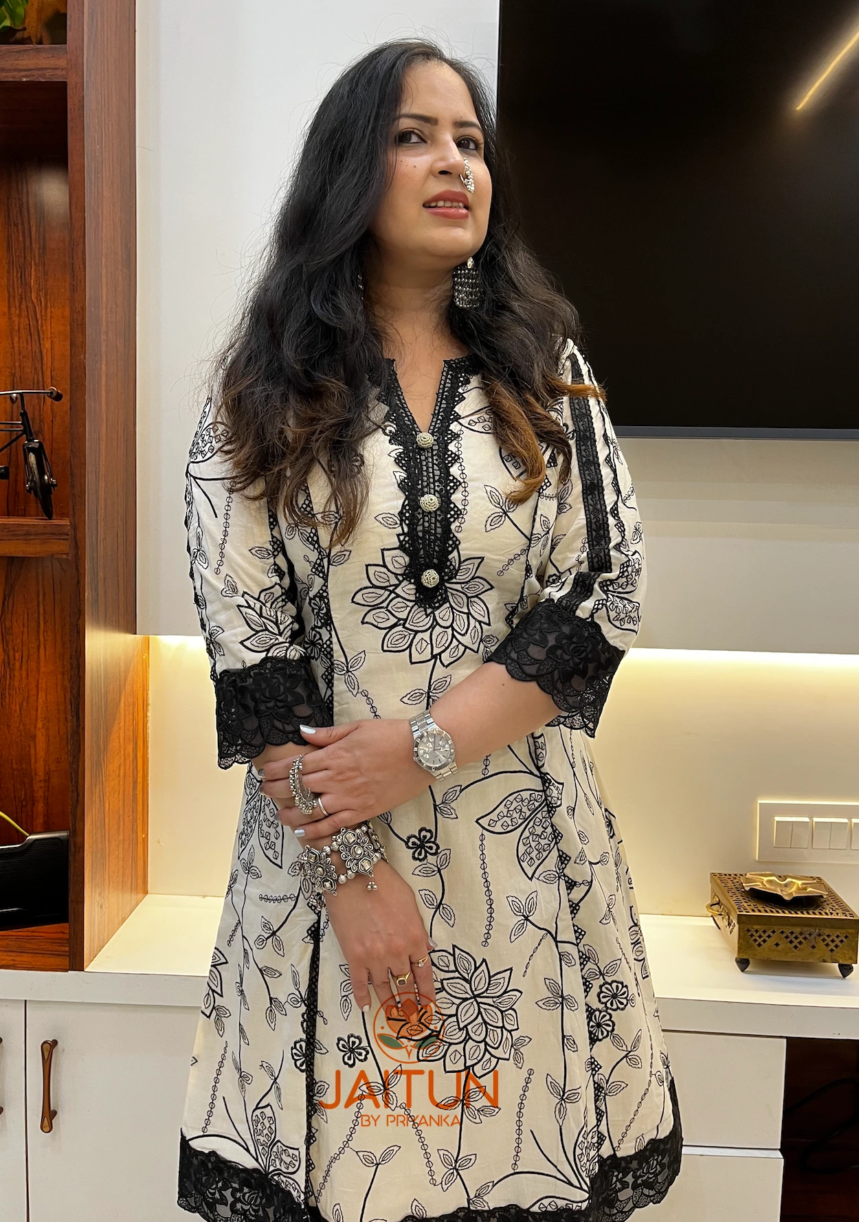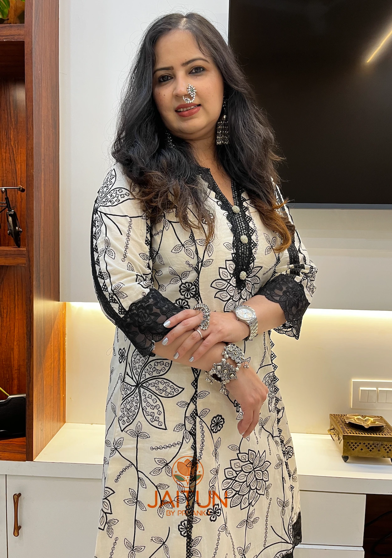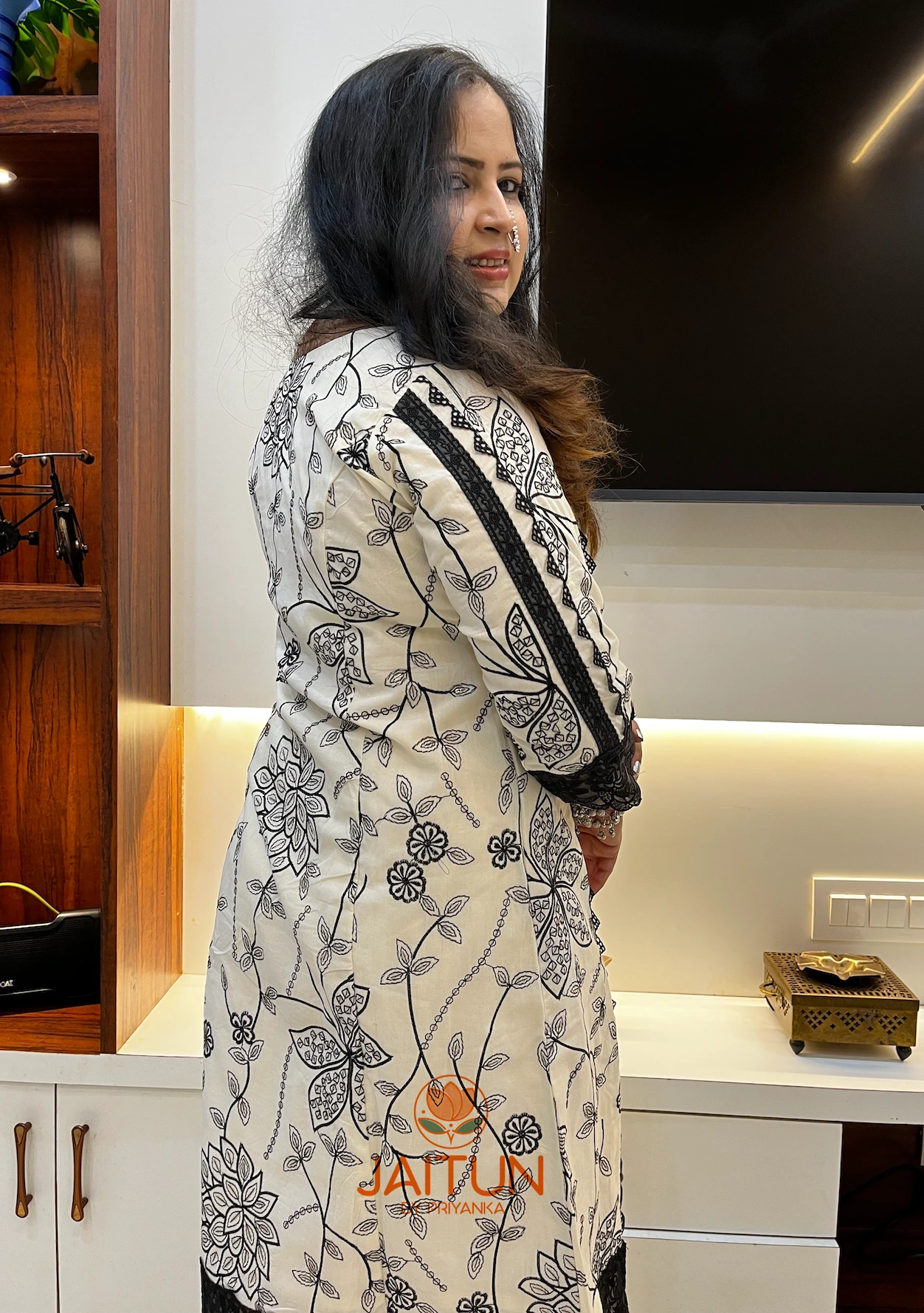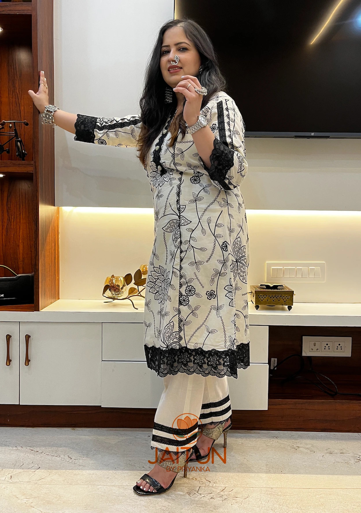 Step into a world of timeless elegance with our “Elegant Floral Embroidered Kurta & Pant Set.” This exquisite ensemble features a beautifully tailored kameez adorned with intricate black floral embroidery that cascades gracefully over a pristine cream fabric. The full-length sleeves and hemline are accentuated by delicate black lace, adding a touch of sophistication and charm. Paired with a sleek pair of coordinating trousers, this suit set is designed to offer both comfort and style. The neckline is embellished with an ornate black beaded detail, creating a focal point that exudes luxury. Perfect for special occasions , this kurta & pant set promises to make you the epitome of grace and poise.