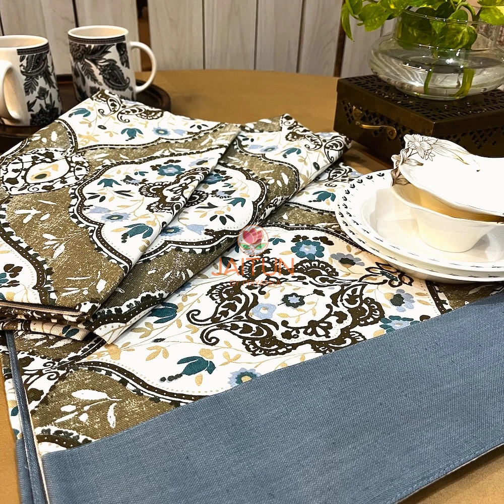 The rich and grounding colour palette combines earthy mocha brown, calming slate blue, and hints of deep teal against a clean white backdrop. This beautiful pattern is perfectly framed by a generous, solid slate-blue border, which adds a contemporary, tailored finish and a lovely pop of solid colour.
