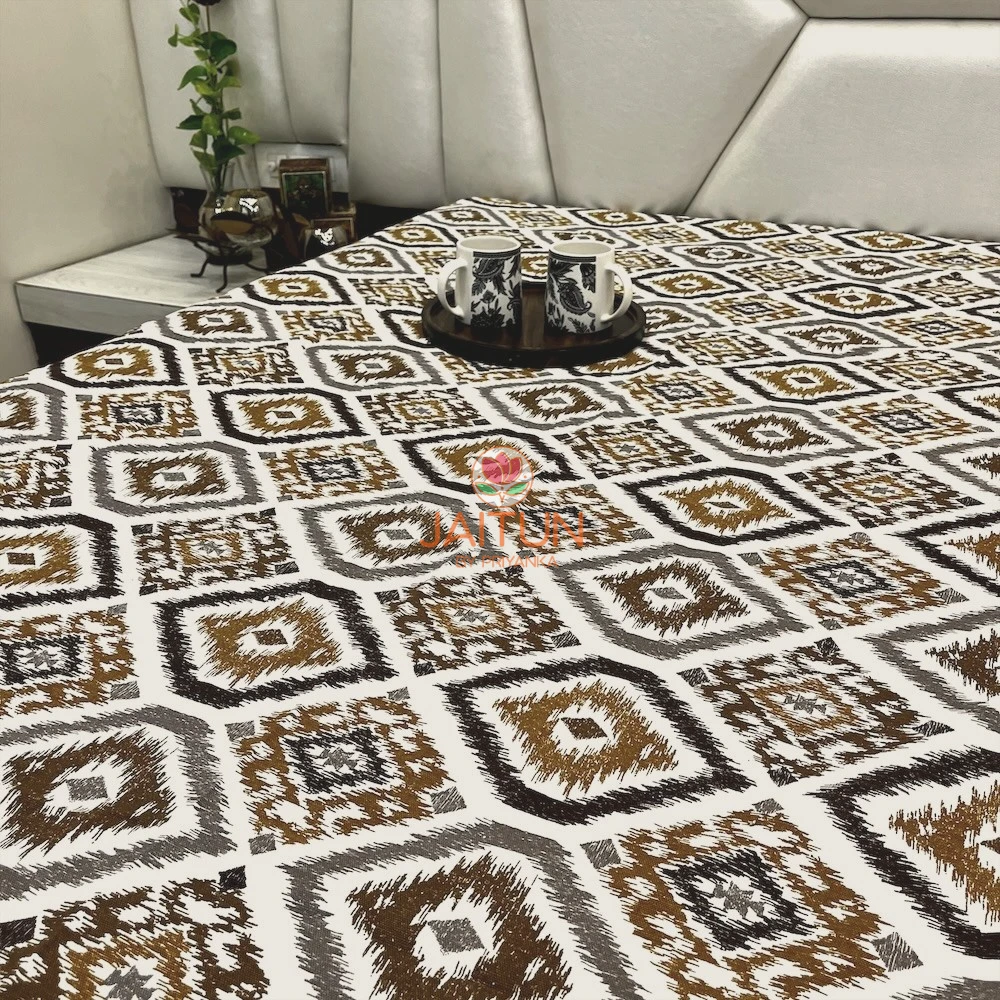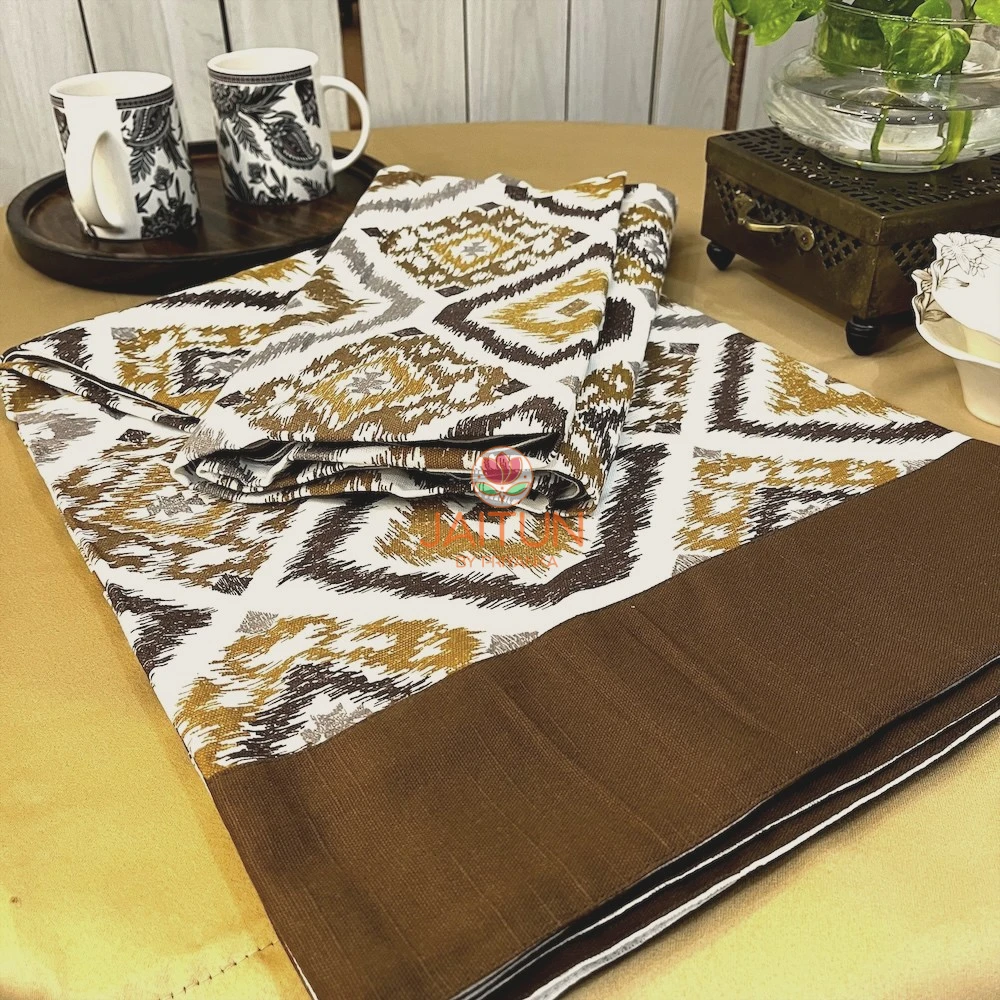 Make a stunning statement with the Kalahari Ikat Geometric Bed sheet Set. Inspired by traditional weaving techniques, this design features a dynamic, large-scale ikat pattern that brings energy and a touch of global sophistication to your space. The rich, earthy palette—a blend of warm caramel, deep espresso brown, and subtle slate grey on a crisp white canvas—creates a visually captivating look that is both modern and rustic.
