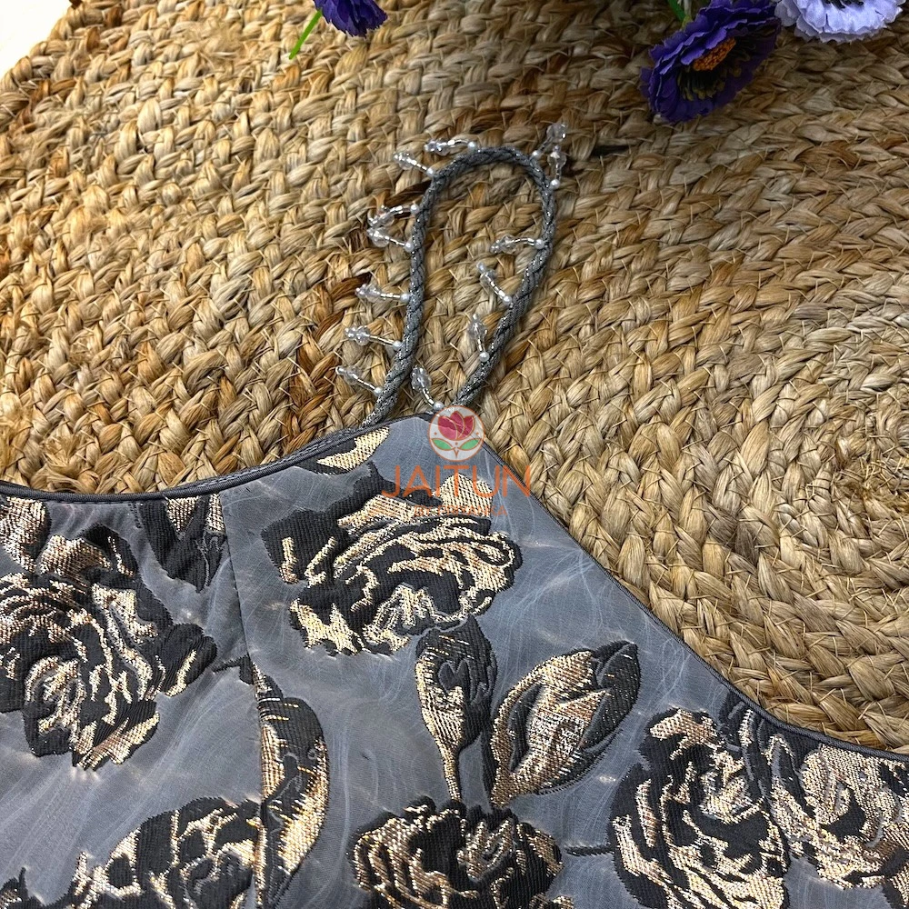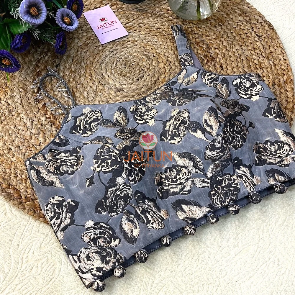 Step into timeless elegance with our Midnight Bloom Metallic Floral Wedding Collection Blouse, a masterpiece designed for grand celebrations. Crafted from premium fabric, this blouse showcases a sophisticated grey backdrop adorned with intricate black and gold metallic floral motifs, exuding regal charm. The sleeveless silhouette with dual strap design offers both comfort and style, while the delicate fabric button accents at the hemline add a touch of bespoke craftsmanship.