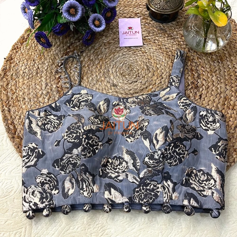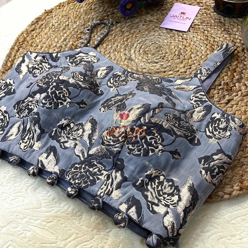 Perfect to pair with sarees, lehengas, or ethnic skirts, this blouse is ideal for weddings, receptions, festive gatherings, and special events. The shimmering metallic weave catches the light beautifully, making you the center of attention. Designed for the modern woman who loves a blend of tradition and contemporary fashion, Midnight Bloom is a must-have in your wedding collection.