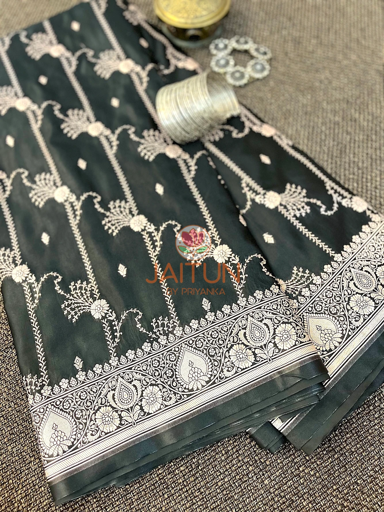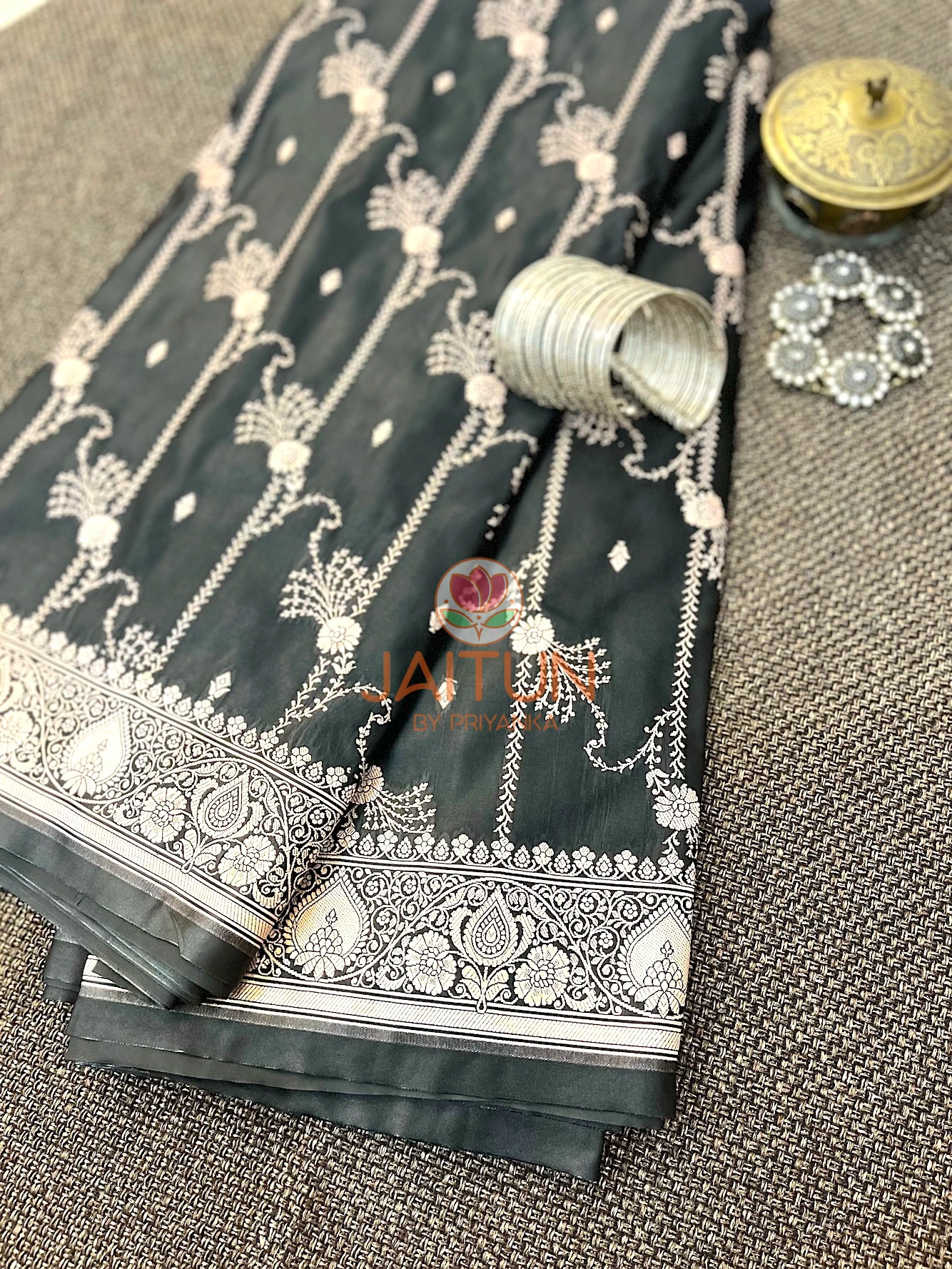 Step into timeless sophistication with this Noir Elegance Banarasi Silk Saree. The rich black body is adorned with vertical silver zari floral motifs, lending it a graceful and regal charm. The saree features a traditionally ornate silver zari border with paisley and floral detailing, creating a luxurious finish. Ideal for weddings, receptions, and formal celebrations, this saree captures the essence of classic Indian craftsmanship with a modern edge.