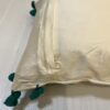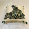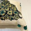 The pillows are further enhanced by charming teal pom-poms adorning the edges, adding a playful and tactile element to the design. This unexpected detail brings a contemporary flair to the traditional peacock motif, making these pillows truly unique.