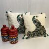 Add a touch of elegance to your home with our Regal Peacock Embroidered Throw Cushion. These cream-colored pillows feature intricately embroidered peacocks in rich greens and golds, adorned with playful teal pom-poms for a whimsical finish.