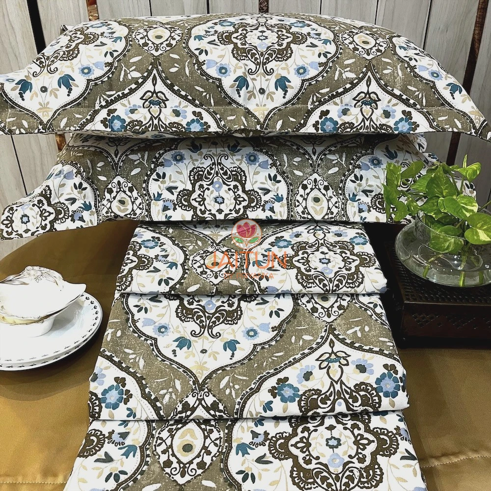 Step into a realm of classic beauty with the Siena Heritage Damask Bed sheet Set. Inspired by traditional tapestries, this exquisite design features majestic, repeating medallions that exude a sense of history and refinement. The sophisticated colour palette combines grounded, earthy siena tones with delicate pops of sky blue and deeper teal, all set against a clean white background for a look that is both ornate and refreshingly modern.