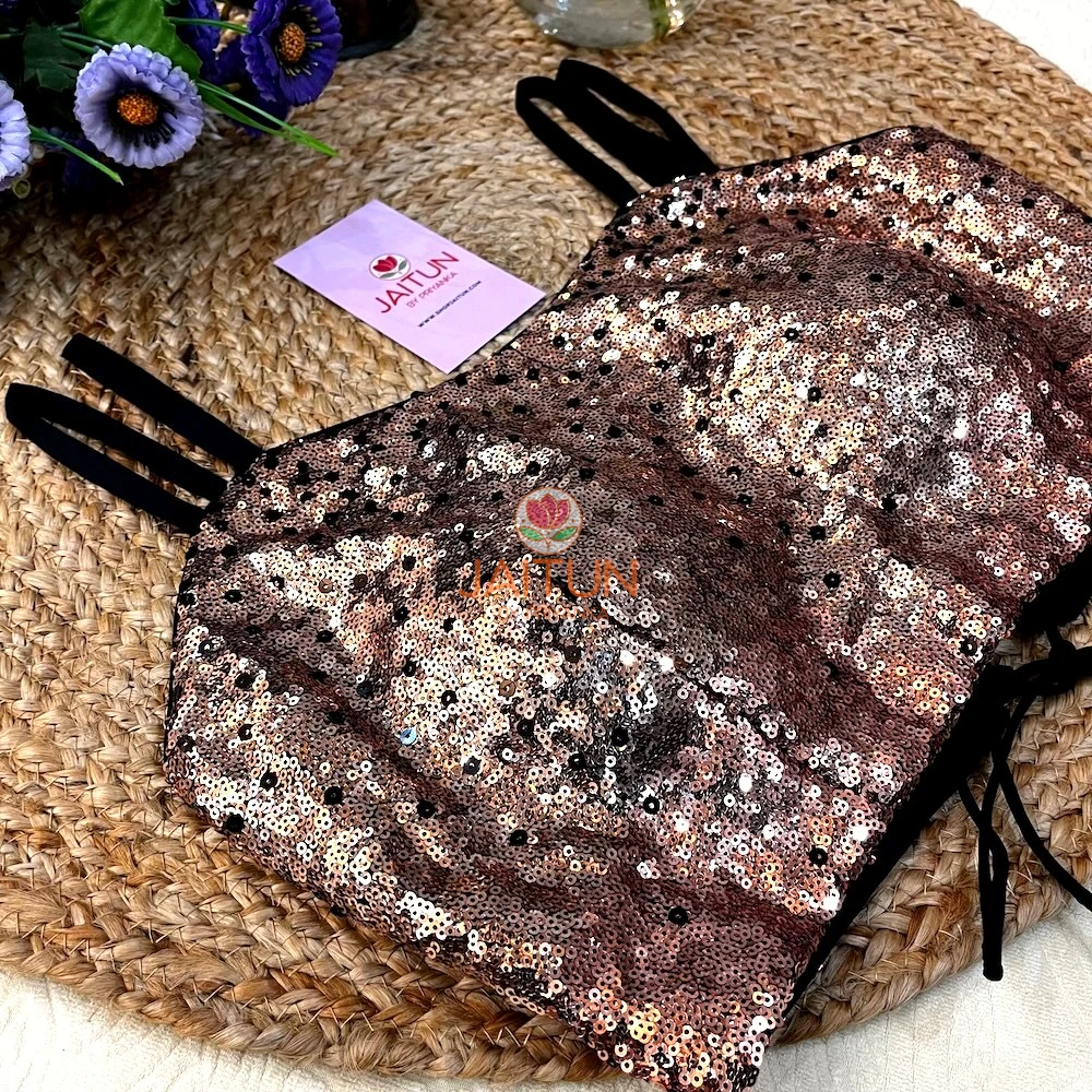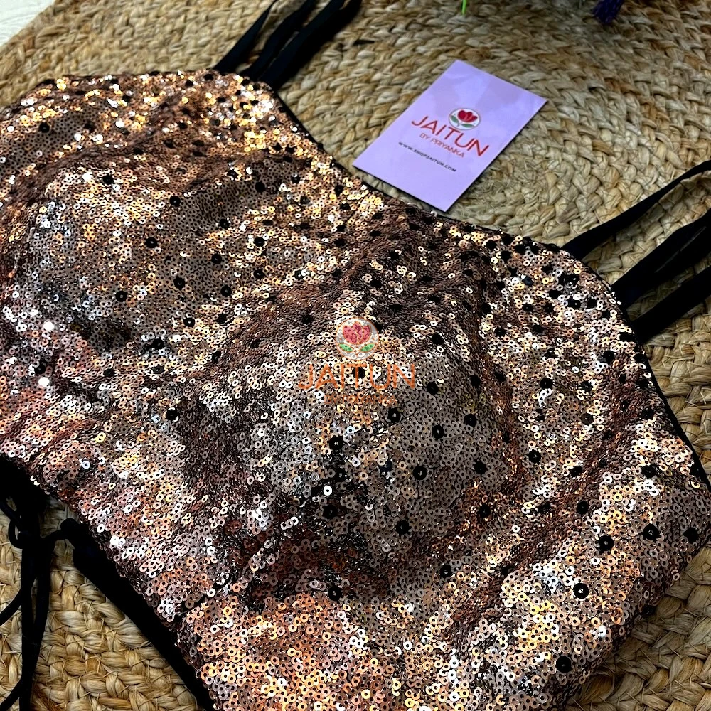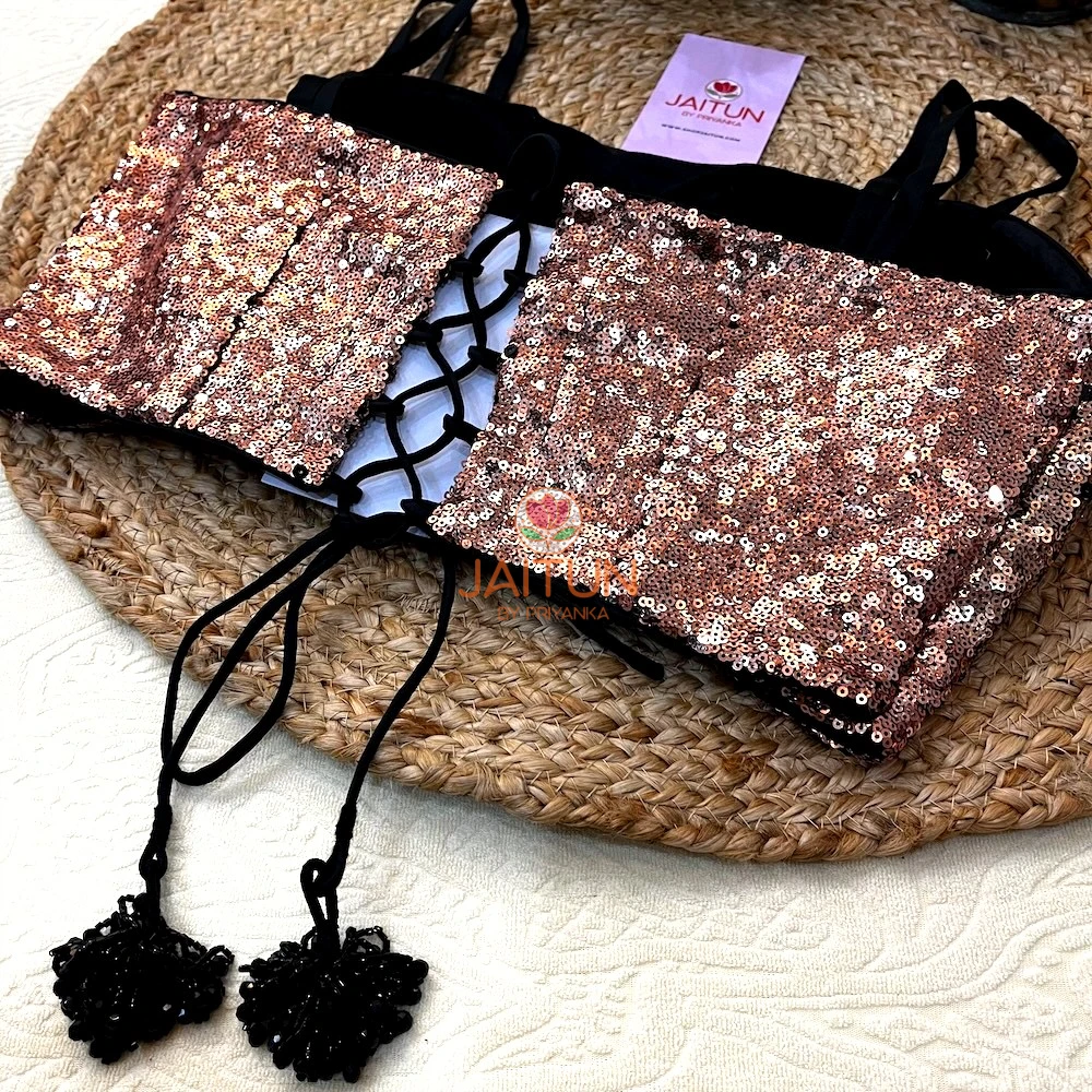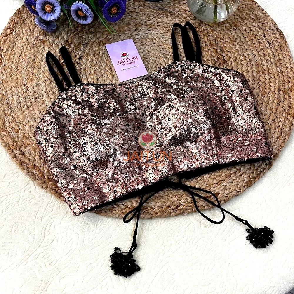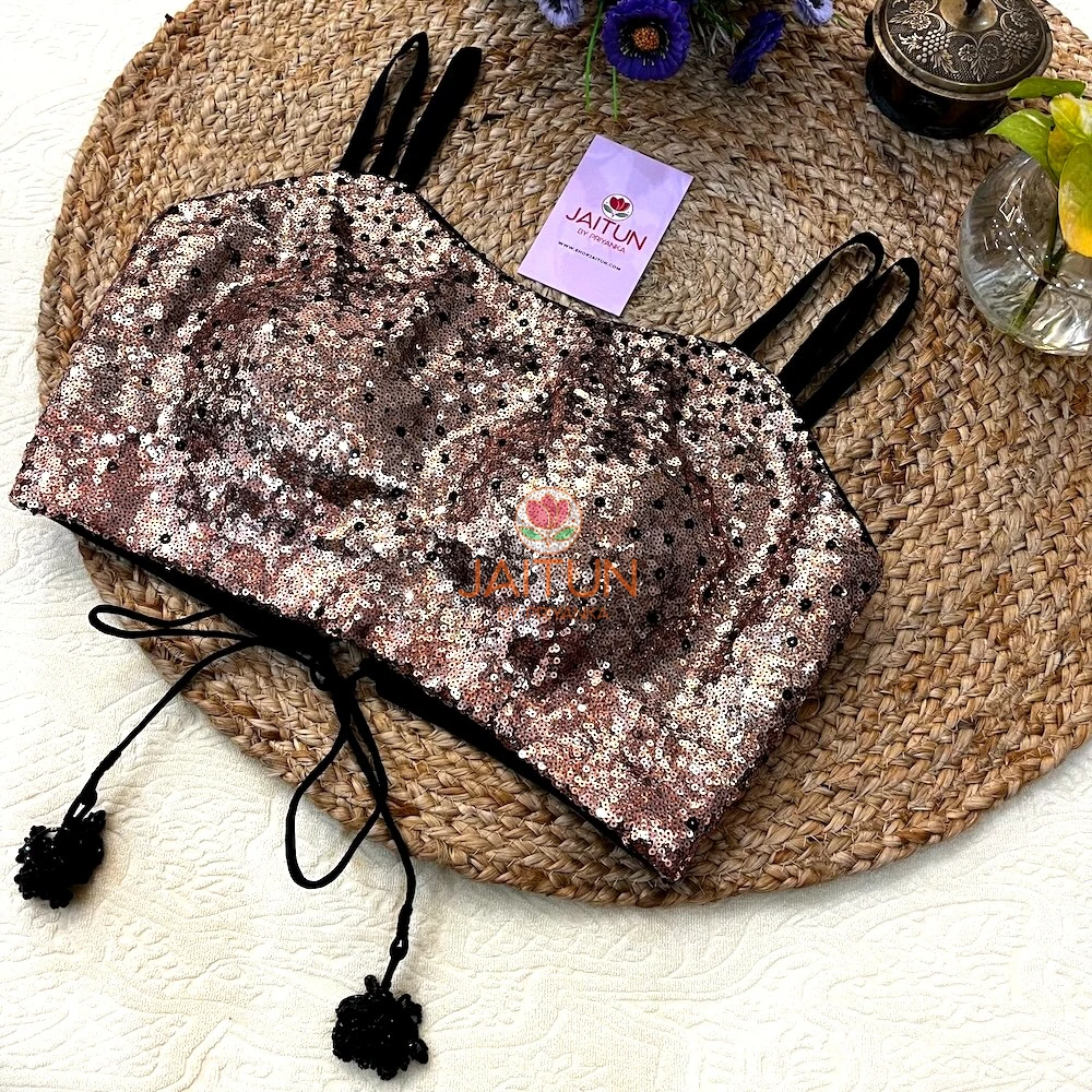 Designed in a dazzling rose gold sequin fabric, this blouse features a structured front-cupped silhouette for a flattering fit. The stylish double shoulder straps add extra support and charm, while the intricate lace-up back with beaded tassel ties ensures a customised and snug fit.